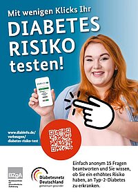 Mithilfe des Deutschen Diabetes-Risiko-Test auf www.diabinfo.de lässt sich anhand von 15 Fragen unkompliziert und anonym das individuelle Risiko ermitteln, innerhalb der nächsten 10 Jahre an Typ-2-Diabetes zu erkranken. Der Test wurde auf wissenschaftlicher Grundlage entwickelt und ist für erwachsene Personen geeignet. Der Flyer in DIN A6 enthält die wichtigsten Informationen zum Diabetes-Risiko-Test und führt mit Internetadrese und QR-Code direkt zum Test.