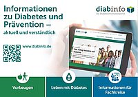Infokarte im Postkartenformat für ärztliche Praxen, Diabetesberaterinnen und Diabetesberater sowie weitere Multiplikatorinnen und Multiplikatoren mit Logo und Internetadresse des Nationalen Diabetesinformationsportals www.diabinfo.de. Das Portal stellt aktuelle, unabhängige, qualitätsgeprüfte und verständlich aufbereitete Informationen rund um das Thema Diabetes mellitus und Prävention zur Verfügung.