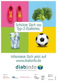 Hier finden Sie die Plakate „Schütze Dich vor Typ-2-Diabetes“ und „Erkenne Dein Typ-2-Diabetes-Risiko“ zum neuen Nationalen Diabetesinformationsportal www.diabinfo.de. Die Plakate zeigen Schutz- bzw. Risikofaktoren von Typ-2-Diabetes und regen dazu an, sich über das Thema zu informieren bzw. den online Diabetes-Risiko-Test durchzuführen.