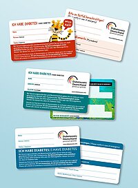 Der Diabetes Notfallausweis ist ein wichtiges Hilfsmittel für Menschen mit Diabetes. Er enthält relevante Informationen für Notfallsituationen in Deutsch und Englisch. So informiert der Ausweis Ärztinnen und Ärzte sowie Ersthelfende über die bestehende Diabetes-Erkrankung. Außerdem liefert er Informationen über eingenommene Medikamente, zu Kontaktpersonen sowie zum Umgang mit Notfallsituationen, z. B. bei Unterzuckerung (Hypoglykämie). Den Ausweis gibt es in verschiedenen Designs: für Kinder, Jugendliche und für Erwachsene.