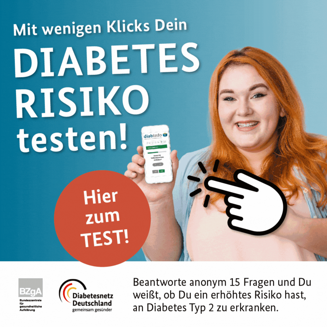 „Mit wenigen Klicks Dein Diabetes Risiko testen – Beantworte anonym 15 Fragen und Du weißt, ob Du ein erhöhtes Risiko hast, an Diabetes Typ 2 zu erkranken.“
